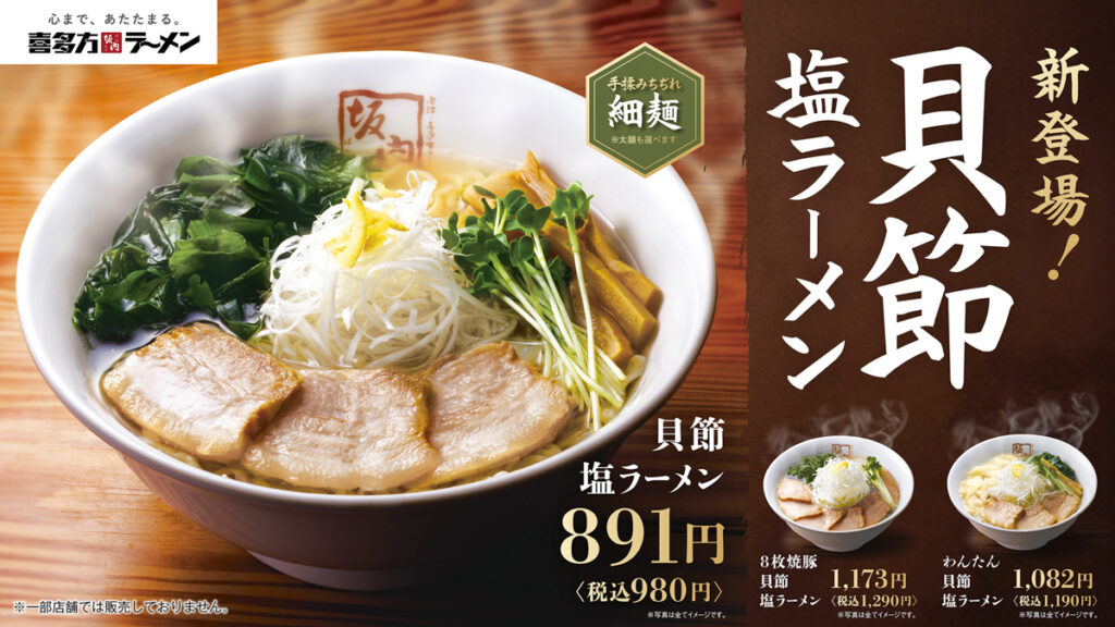 「喜多方ラーメン坂内」にて提供開始される『貝節塩ラーメン』は、3種の貝(ほたて・はまぐり・あさり)の芳醇な旨味と鰹節と昆布の奥深い風味が合わさったスープに、坂内自慢の麺の細麺を合わせた一品。※太麺も選べます。