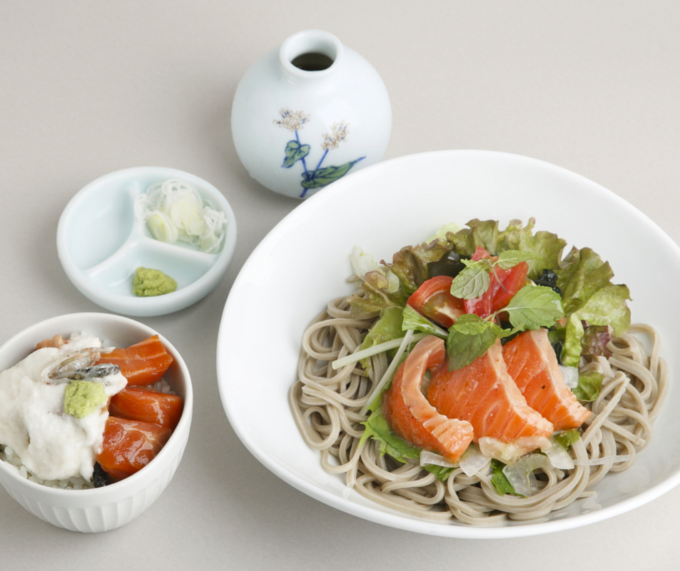 ■【13階】「総本家 小松庵」北海道二海サーモンマリネのサラダ蕎麦と漬け山かけ御飯 2,800円