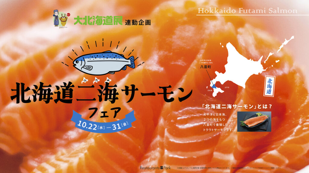 10月22日(水)より開催される『北海道二海(ふたみ)サーモン フェア』では、八雲町で養殖されている「北海道二海サーモン」を使った期間限定メニューが展開されます。