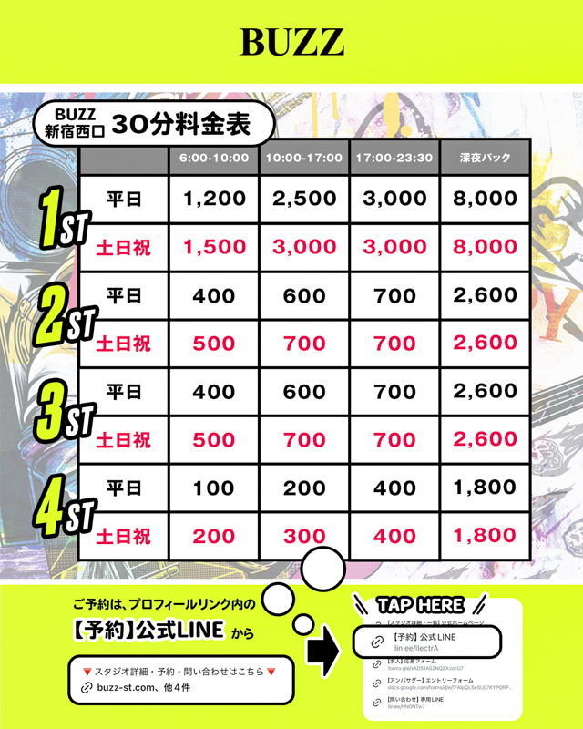 『BUZZ新宿西口』は、個人練習から少人数グループまで対応する6スタジオを完備した本格的なレンタルスタジオ。