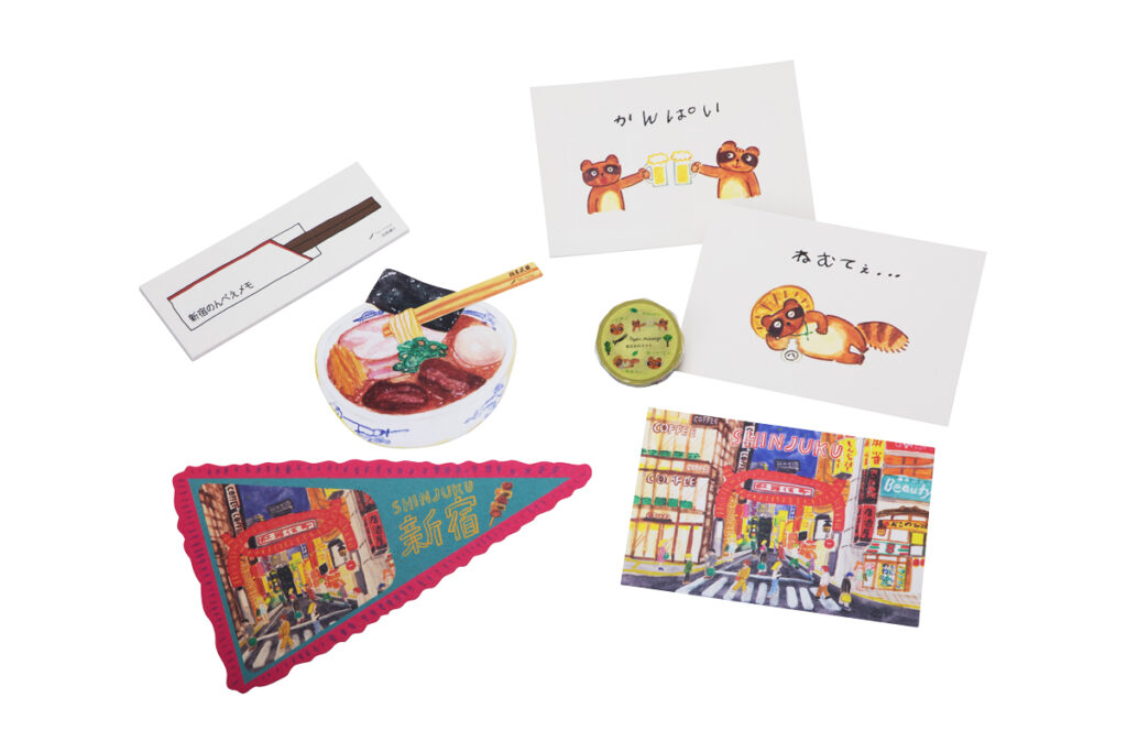 新宿ゆかりの3社『新宿中村屋』『追分だんご本舗』『麺屋武蔵』とコラボレーションし、各企業の看板商品やロゴデザインのステッカー、アクリルキーホルダーなどが数量限定で販売されます。
