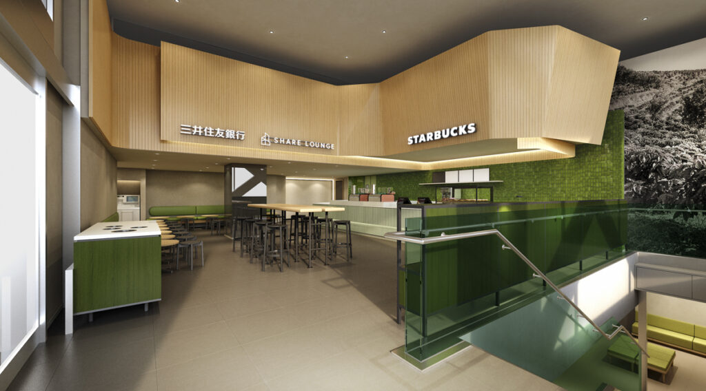 1階と地下1階にスターバックスが出店し、地下1階には銀行の窓口やATMを併設。