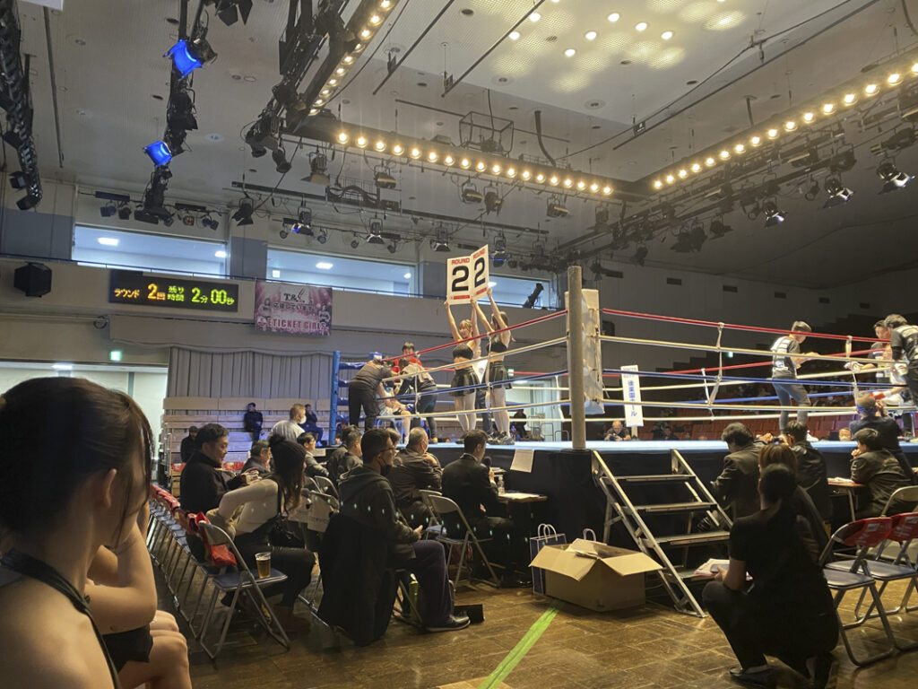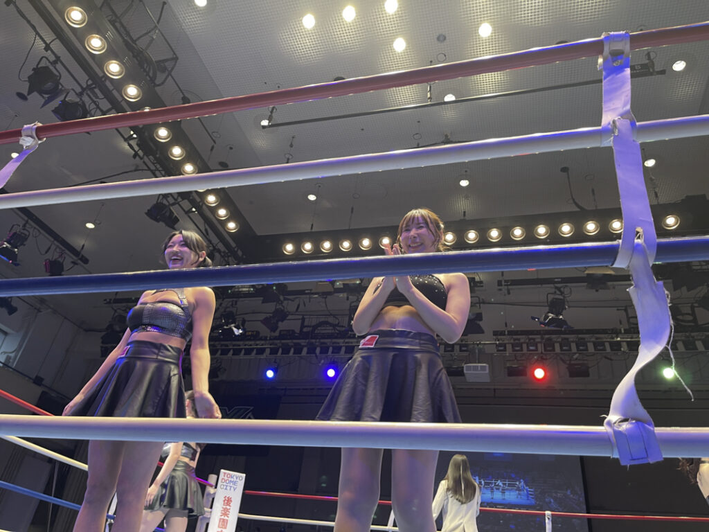 選手だけでなく、ラウンドガールも横断幕や等身大バナー、登り等で存在感を示すことで、イーチケRGはラウンドガール達で率先して会場を華やかに演出することで会場全体の盛り上がりに貢献できるはず…とイーチケRG代表のAsamiは言っていました。