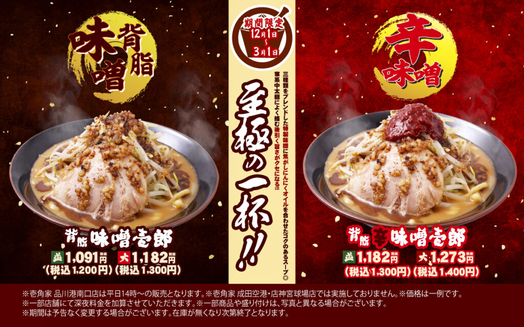 新宿3丁目にある「壱角家 新宿靖国通店」では、冬の定番メニュー『背脂味噌壱郎』『背脂辛味噌壱郎』を2025年12月1日(月)より期間限定で開催。詳細をご紹介します。