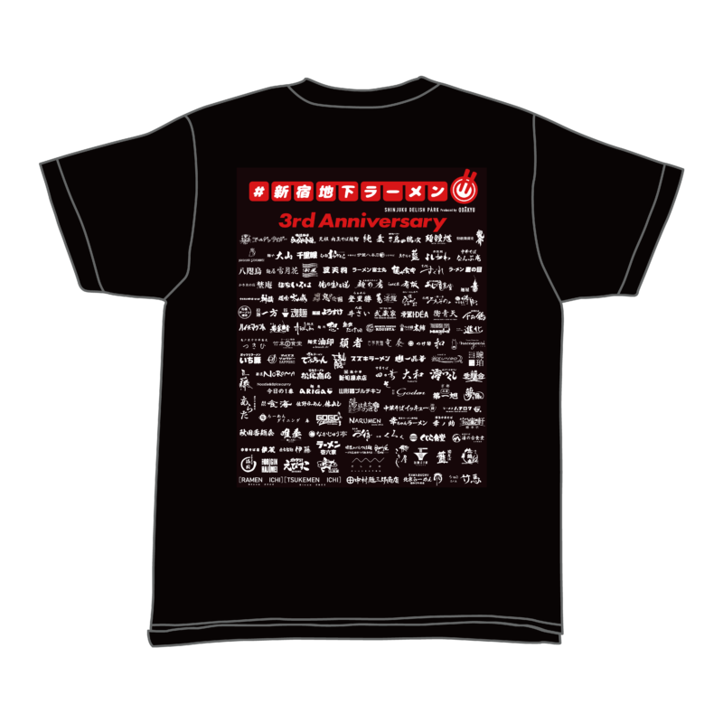 オリジナルTシャツの背面には、これまで『#新宿地下ラーメン』に出店した全122のラーメン店のロゴが背中にプリントされており、販売価格は4,400円。