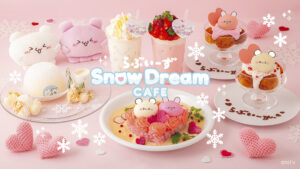 『らぶいーずのSnowDream CAFE』では、究極に可愛いシチューライス、雪山をイメージしたパスタ、あったかいスープ、すもっぴとぴょんちーのキュートなドーナツ、かまくらをイメージしたムース、キャラクターをイメージしたドリンク、もりもりに盛り付けられた贅沢なドリンクなど、冬が楽しくなるようなこだわりメニューが提供される他、描き起こしアートを使用したカフェオリジナルグッズや特典なども登場します。