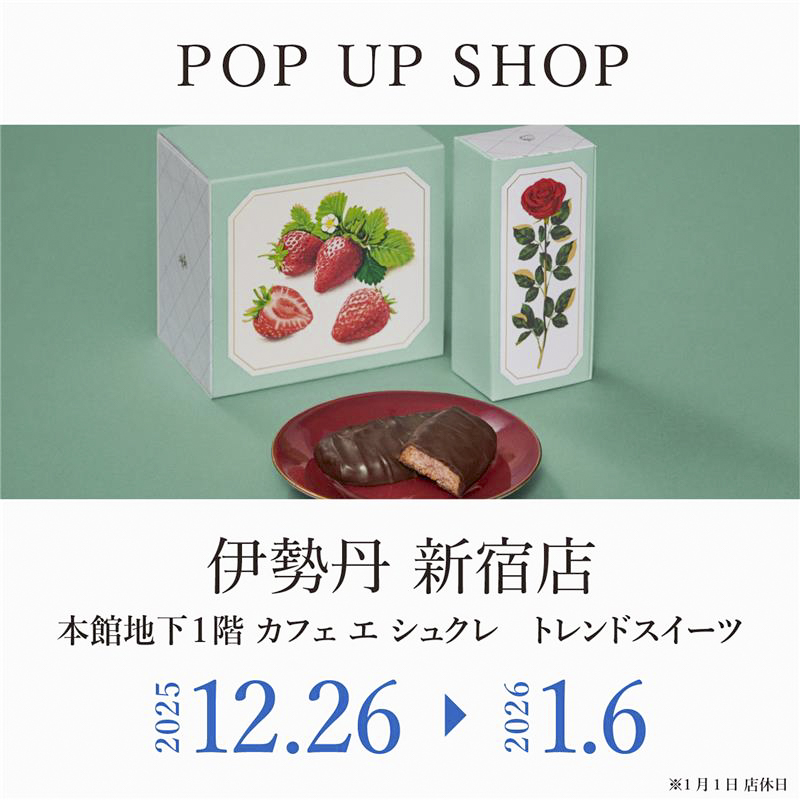 伊勢丹新宿店 本館地下1階 カフェ エ シュクレ【トレンドスイーツ】で展開されるポップアップショップでは、2026年1月7日より発売予定の「季節のショコラサブレ あまおう苺」が先行販売開始となる他、年末年始の挨拶にもおすすめの「ルル メリー」定番商品が購入できます。