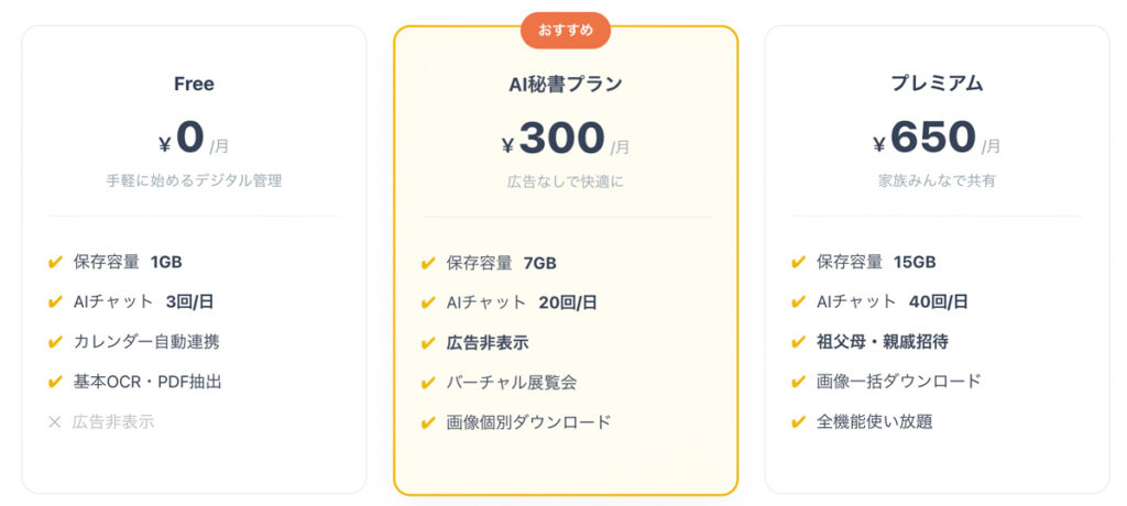 無料で始められるFreeプラン、広告非表示で快適に使えるAI秘書プラン、家族全体で共有できるプレミアムプラン。