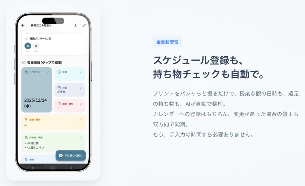 プリントを撮影するだけで、行事予定や提出期限を自動で抽出し、カレンダーに登録が可能です。