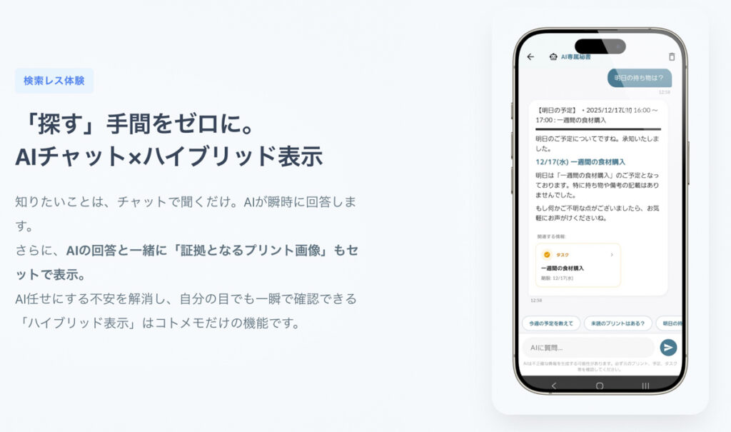 『コトメモ』は、プリントを「保存する」のではなく、「AIに聞く」ことで管理する新しいスタイルを提案しています。