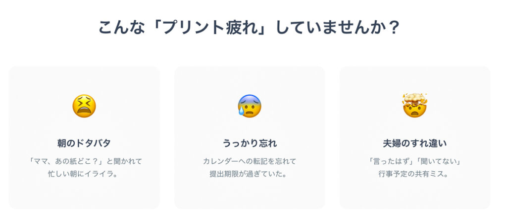 必要な情報だけをすぐに把握できるため、「朝のドタバタする時間帯」でのイライラが減少し、「提出期限のうっかり忘れ」「共有ミスによる夫婦のすれ違い」がなくなります。