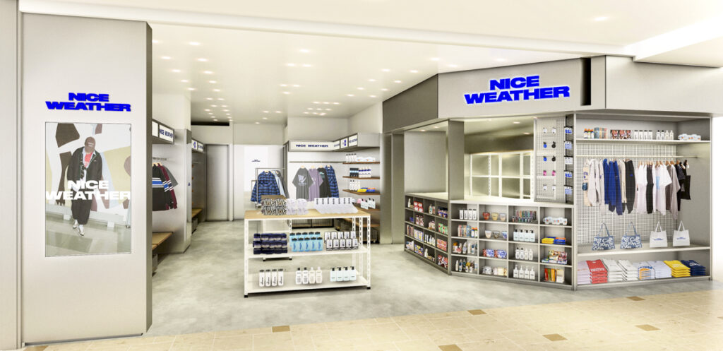 今回新たにオープンする新宿店では、「NICE WEATHER」の世界観を再現した店内で、Tシャツ、カット、シャツ、スウェットなどのウェアをはじめ、キャップ、バッグ、キーホルダー、コスメなどの多彩なアイテムを取り揃えます。