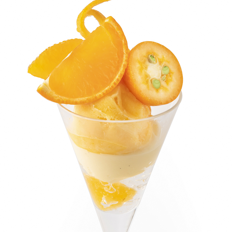 店内製造のオレンジシャーベットに、柑橘ソース、コアントローゼリー、ディプロマットクリームを合わせたパフェです。