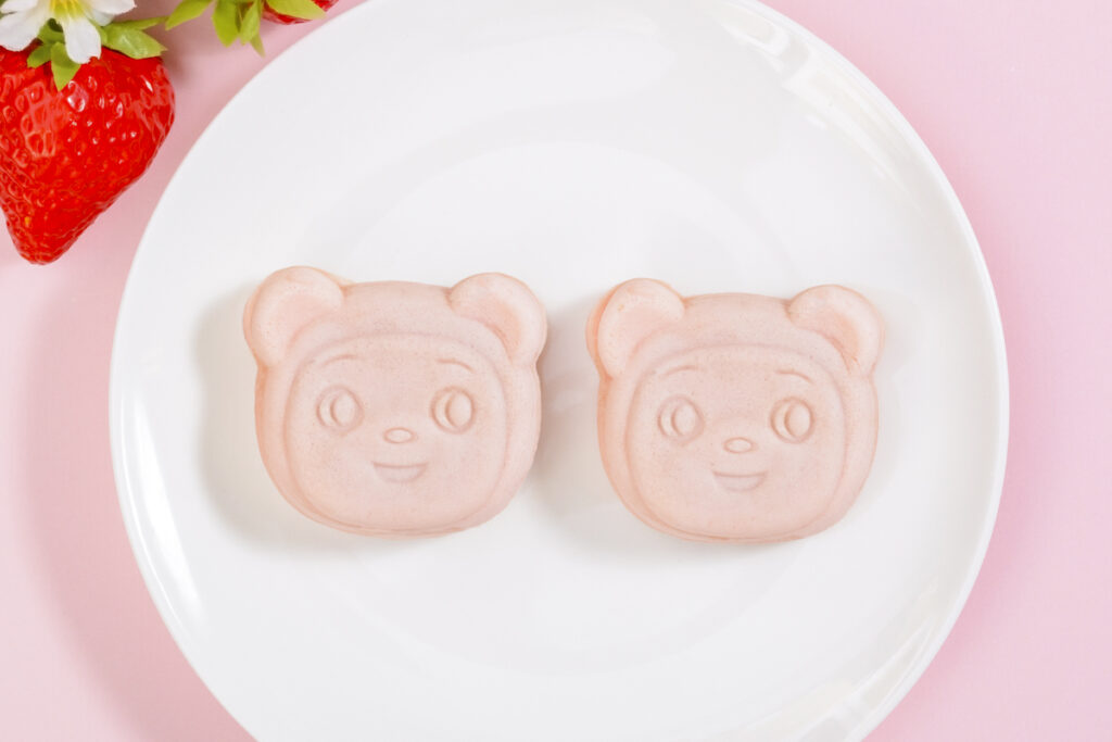苺の種のつぶつぶ感がアクセントになっていて、こぐまの顔は、米粉とタピオカ粉をブレンドしたオリジナルのもっちもち生地です。