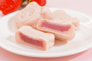 春限定「春のこぐま焼き あまおういちご」は、福岡県産あまおう苺を使用し、甘酸っぱい餡がたっぷり入った人形焼。
