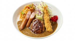 カレーライスに、ナポリタンやハンバーグ、エビフライ、ウインナーがトッピングされた豪華な一皿です。