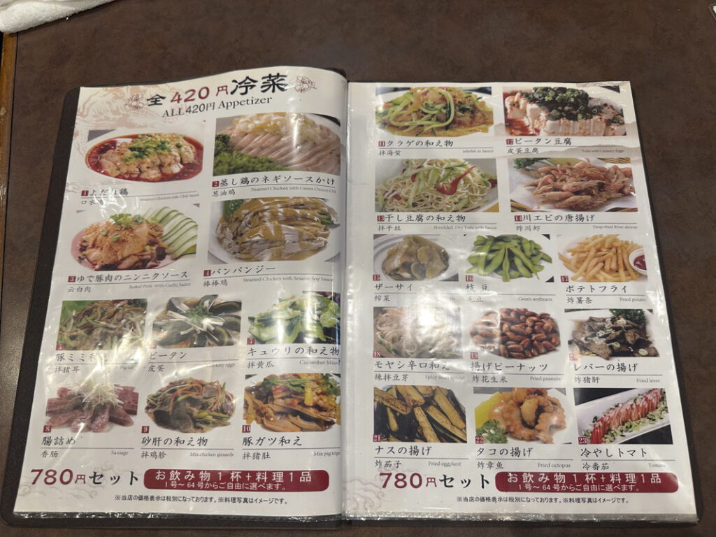 税別420円の冷菜は全23種類を用意。さらにドリンクとのセットは780円と、破格の安さに驚きます。