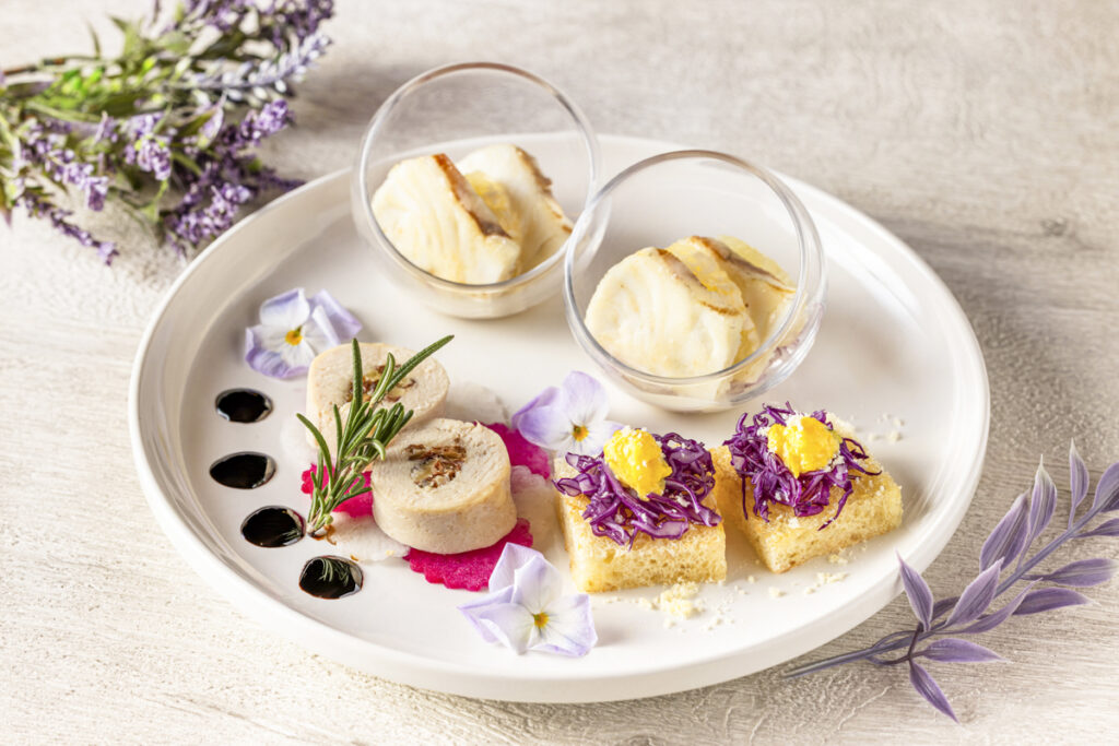 【下段】鯛とグレープフルーツのポワレ ブールブランソース / 鶏むね肉のインボルティーニ レーズンとクルミのアクセント / 紫キャベツとスクランブルエッグのトースト