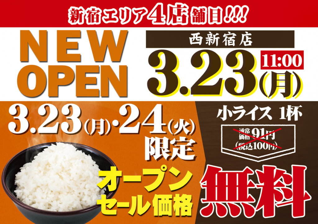 2026年3月23日(月)のオープンを記念し、23日と24日限定で「小ライス(税込100円)」が無料で提供されます。